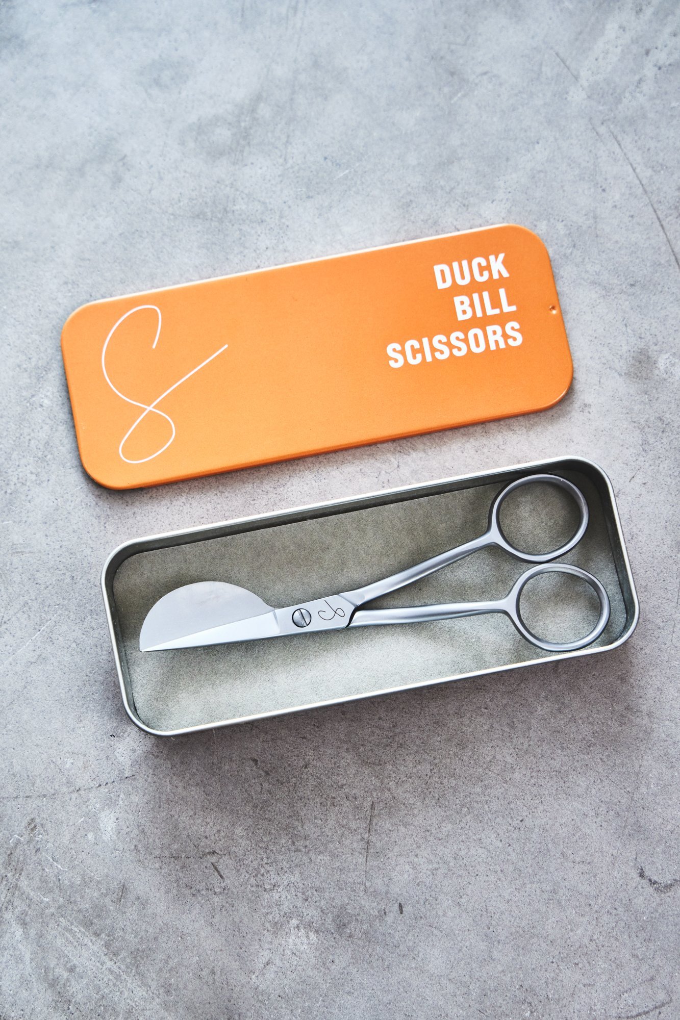 Tijeras de pico de pato en acabado acero mate con hoja ancha y plana tipo ‘pico de pato’ y mango ligeramente angulado, que permite cortar tejidos muy cerca de las puntadas.